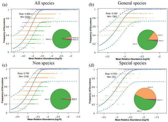 Relative abundance distribution of rhizosphere soil microorganisms across different orchid species. (a) Total microbial community; (b) generalist species; (c) neutral taxa; (d) specialist species. Non-species represents the concept of neutral taxa. Cl represents Confidence Interval, Rsqr represents R-squared, and “Nm” represents Number of Measurements.