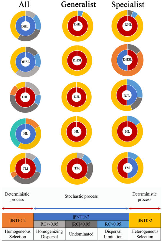 During the assembly of rhizosphere soil bacterial communities, different species of Orchidaceae exhibited notable differences in their ecological strategies. The rhizosphere soils of C. amoena, C. macranthos, and C. faberi were primarily influenced by heterogeneous selection within deterministic processes. In contrast, in the rhizosphere soils of C. appendiculata and G. elata, non-dominant processes within stochastic frameworks were predominant. In the assembly of rhizosphere soil bacterial communities of generalized species, heterogeneous selection within deterministic processes was dominant across all five Orchidaceae species. In contrast, in the rhizosphere soil of C. macranthos for specialized species, homogeneous selection within stochastic processes was prevalent (Figure 5).