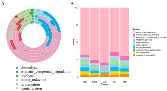 The pie charts representing metabolic functions indicate that fermentation predominates among the metabolic functional bacteria within the soils of the five Orchidaceae species. In the soil bacterial community of C. appendiculata, fermentation comprises as much as 81.15%. In the soil of G. elata, fermentation and chitinolysis are notably prevalent, accounting for 64.20% and 16.76% of the metabolic functional bacteria, respectively. In the soils of C. amoena and C. faberi, nitrate respiration is more pronounced (Figure 6A).