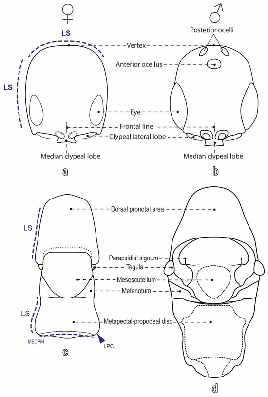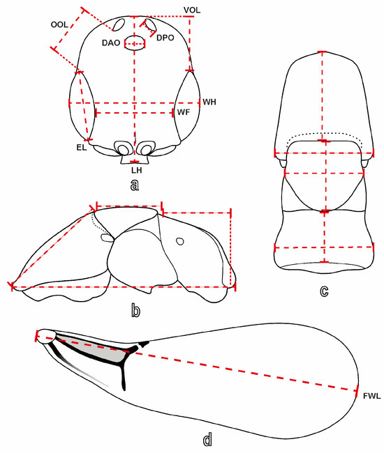 The nomenclature of the integument sculpture follows Harris [41], while the general morphological terms follow Azevedo et al. [1] and Lanes et al. [42] (Figure 1 and Figure 2). Measurements and indices (Figure 3) used in this study are defined as follows: BL (body length), measured from the apex of the clypeus to the posterior margin of the last metasomal segment; FWL (forewing length), measured from the tegula to the distal margin; LH (length of head), measured in the anterior view from the vertex crest to the median apical margin of the clypeus; WH (width of head), measured in the anterior view as the maximum width, including the eyes; WF (width of frons), measured in the anterior view as the minimum width, usually at the lower margin of the eyes; EL (eye length), measured in the lateral view across its maximum height (length); OOL (ocello–ocular line), measured in the latero-dorsal view as the shortest distance from the dorsal margin of the eye to the posterior ocellus; VOL (vertex–ocular line), measured in the dorsal view, the maximum distance from the eye margin to the vertex crest; WOT (width of ocellar triangle), measured in the anterior view as the maximum width, including the ocelli, DAO (diameter of anterior ocellus), and DPO (diameter of posterior ocellus).