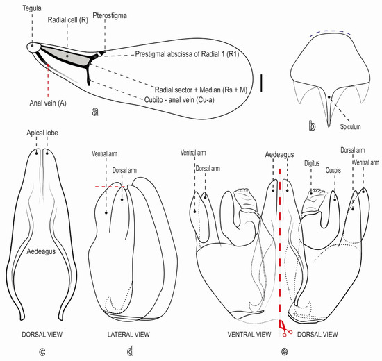 Labeled diagram of a male of S. cereicollis (reared specimen). (a) Forewing, dorsal view; (b) hypopygium, ventral view (dashed lines indicate the posterior margin; (c) aedeagus; (d) genitalia in lateral and (e) ventral/dorsal views, separated by a red dashed line.