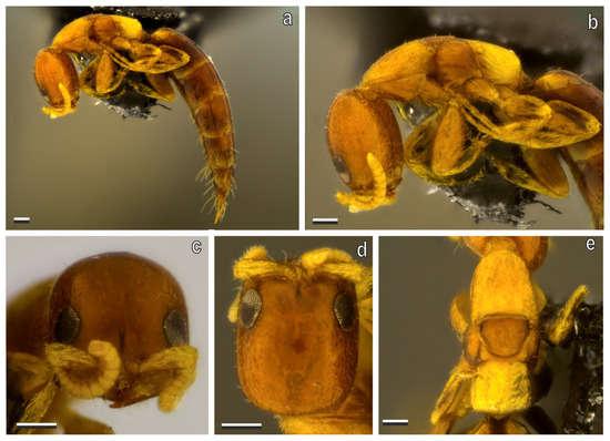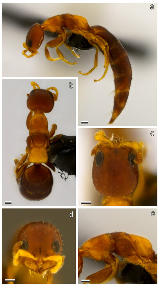 Head (Figure 4c,d and Figure 5c–e). Head rectangular, 1.15× as long as wide, in dorsal view; globoid in lateral view, sides slightly outcurved and moderately converging anterad, posterior margin of vertex slightly outcurved in dorsal view; frons, vertex and gena imbricate, with few punctures; frontal line sulcate, well-defined and short; mandible robust with three apical teeth, dorsalmost one small, two ventral large and sharp; median clypeal lobe as long as lateral lobes, surface elevated medially; eye subtriangular, flat, located dorso-laterally with gena visible dorsally, next to mandibular base, longer than half VOL, distance from torulus to eye 2.40× torulus width; LH 3.47× EL, WF 1.63× EL; scape slightly curved, wider apically, longer than EL, pedicel longer than flagellum, flagellomeres wider than long, except for distal one, which is elliptical with acute apex; ocelli absent.
