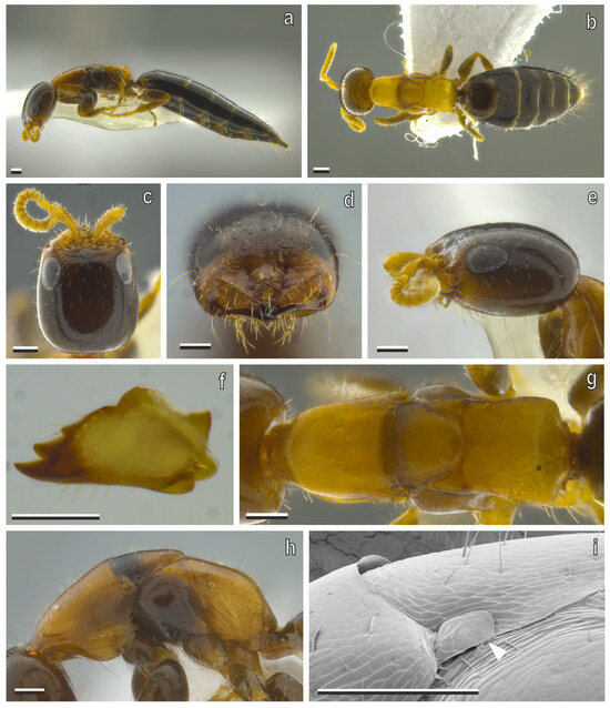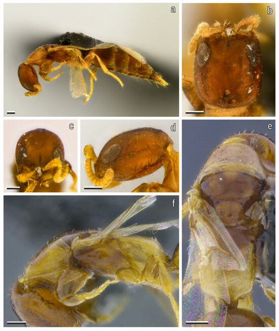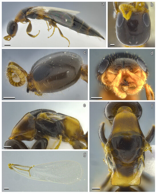 Description, micropterous female (holotype). (Figure 10a–g) Measurements (mm). Body 3.13, LH 0.53, WH 0.5, WF 0.28, EL 0.16, VOL 0.31, mesosoma 1.0, metasoma 1.6. Color. Head, antenna, mesosoma, and legs light castaneous, metasoma castaneous. Setation. Head with scarce and scattered setae, on gena few setae shorter than EL; flagellum with short and dense suberected setae; mesosoma and metasoma with scarce and scattered setation.