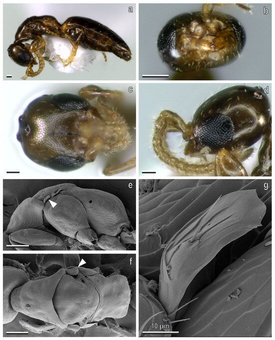 S. cereicollis, micropterous male (reared specimen). (a) Habitus, lateral view; (b) head in anterior, (c) dorsal, and (d) lateral views; (e,f) scanning electron microscopy (SEM) of metasoma in (e) lateral and (f) dorsal views, showing the tegula (white arrowhead); (g) detail of the tegula. Scale bars: (a–f) 100 μm; (g) 10 μm.