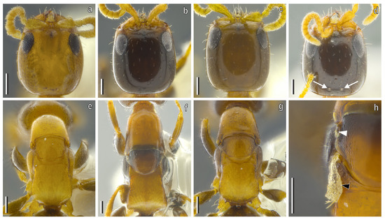 Morphological variations in micropterous females of reared specimens and the type series. Micropterous females of S. cereicollis reared in the university lab: (a–d) head and (e–g) mesosoma; (d) posterior ocelli (white arrowheads) in a micropterous female of S. cereicollis reared in the university lab; (h) forewings (white arrowhead) and undeveloped hind wing (black arrowhead) in a micropterous female of S. cereicollis (reared specimen), dorsal view. Scale bars = 100 μm.