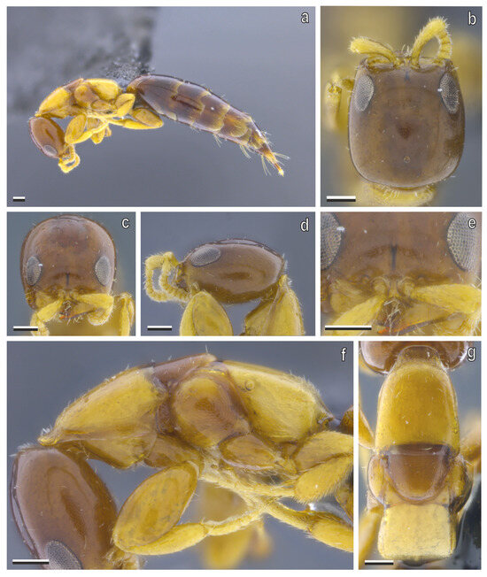 S. annobonensis Masini, Colombo & Azevedo sp. nov. micropterous female (holotype). (a) Habitus, lateral view; (b) head in dorsal, (c) anterior, and (d) lateral views; (e) detail of clypeus, anterior view; (f) mesosoma in lateral and (g) dorsal views. Scale bars = 100 μm.