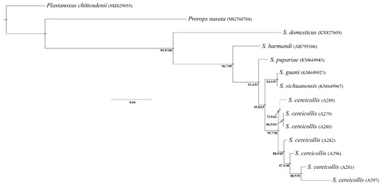 The nucleotide alignment was used to reconstruct a maximum likelihood (ML) phylogeny and to assess genetic variability within S. cereicollis. The substitution model TIM2+F+I was selected using ModelFinder in IQ-TREE version 2.1.1 [50] under the Bayesian Information Criterion (BIC). The ML tree was then generated with ultrafast bootstrap [51] and SH-aLRT support values [52], both calculated using 10,000 resampling replicates. The resulting ML topology was visualized using FigTree version 1.4.3 [53]. The tree was rooted using P. chittendenii (Bethylidae, Scleroderminae).