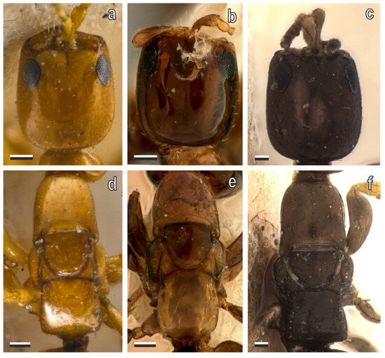 Mesosoma. (Figure 10f,g) Surface imbricate; dorsal pronotal area bell-shaped, longer than wide, sides straight or nearly so, posterior margin nearly straight; mesonotum isosceles triangle-shaped, sides almost straight, posterior margin rounded, wider than long, with its posterior margin touching anterior margin of metapectal–propodeal disc; metanotum without metanotal trough and metanotal fovea; metapectal–propodeal disc trapezoidal, anterior margin nearly outcurved, sides straight or nearly so, and tending to slightly diverging posterad, in dorsal view, anterior width rate 0.81× posterior width; marginal edge between disc and lateral surface of metapectal–propodeal complex bluntly right-angled (90–180°), in posterior view, marginal edge between disc and posterior margins rounded, forming single convexity, in lateral view, metapectal–propodeal disc 0.72× as long as width, shorter than mesonotum, latero-posterior corners rounded, smoothly curved, without distinct angle or point, in postero-dorsal view; lateral marginal, metapostnotal median and posterior transverse carinae absent.