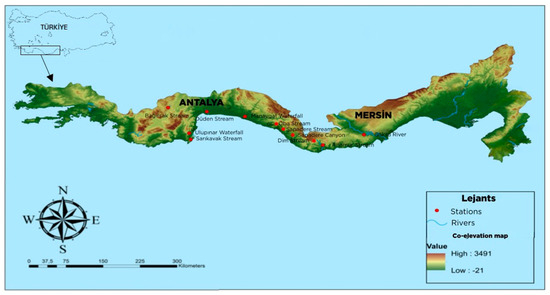 Benthic macroinvertebrates and water samples were collected from 11 stations in the Mediterranean region of Türkiye (Figure 1). The stations are located in the three freshwater basins of Türkiye: the Western Mediterranean, Antalya, and Eastern Mediterranean (Table 1). The Western Mediterranean Basin consists of a group of precipitation areas that discharge water into the Aegean and Mediterranean Seas in southwest Anatolia. The basin area is approximately 21,223 km2, and the ratio of the basin to the area of Türkiye is 2.7% [29]. Antalya Basin is located in the southern part of the Mediterranean Region of Türkiye, between the Western Mediterranean and the Eastern Mediterranean Basins. The basin area is approximately 20,331 km2 and covers approximately 3% of the surface area of Türkiye. The Eastern Mediterranean Basin is located in the south of Türkiye and is adjacent to the Konya Closed Basin in the north, the Seyhan Basin in the east, and the Antalya Basin in the west. The Eastern Mediterranean Basin, with an area of approximately 2,180,704 hectares (ha), constitutes approximately 2.8% of Türkiye’s surface area [30].