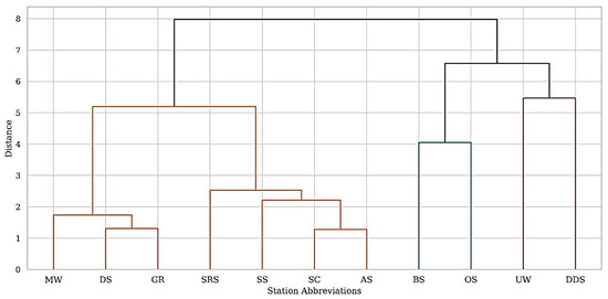 Dendrogram of sampling stations based on environmental parameters. Stations closer on the branches show higher similarity, while branch colors are automatically assigned by the software for visualization only.