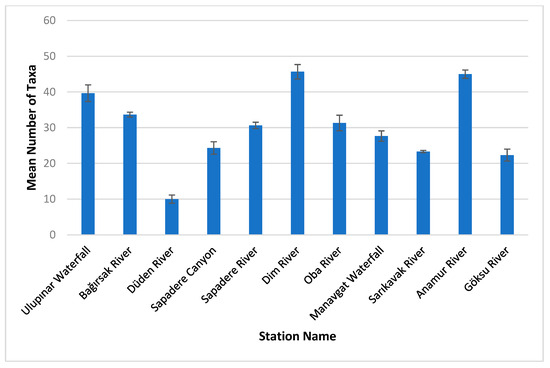 The dominance values of the general zoobenthic communities are listed in Table S1. A total of 177 taxa and 5331 specimens of benthic macroinvertebrates were evaluated in this study. Among the taxa, 12 species were from the class Gastropoda (Mollusca), two from the class Bivalvia (Mollusca), 25 from the class Clitellata (Annelida), 134 from the class Insecta (Arthropoda), and four from the class Malacostraca (Arthropoda). The dominant class was Insecta. The highest number of species was in the Order Diptera, with 77 species. Orders Plecoptera and Coleoptera had the lowest number of taxa, with four and six, respectively. Anamur Stream had the highest number of taxa, with 55 species, followed by Dim Stream and Ulupınar Waterfall, with 52 and 45 species, respectively. Düden Stream had the lowest number of taxa, with 12 species (Figure 3). Nais pardalis from Clitellata was detected at nine stations, and Gyraulus albus from Gastropoda was identified at eight. Caenis macrura (Ephemeroptera) was the dominant taxon at the sampling stations, followed by Hydrobia sp. (Gastropoda). Leuctra inermis (Plecoptera) and Ecnomus sp. (Trichoptera) were the least abundant.