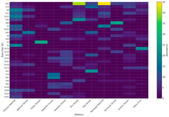 HeatMap showing the abundance of the top 30 benthic macroinvertebrate taxa across the sampling stations. Rows represent taxa (S1–S30) and columns represent stations. Color intensity indicates abundance, with darker purple reflecting lower values and yellow representing the highest abundances.