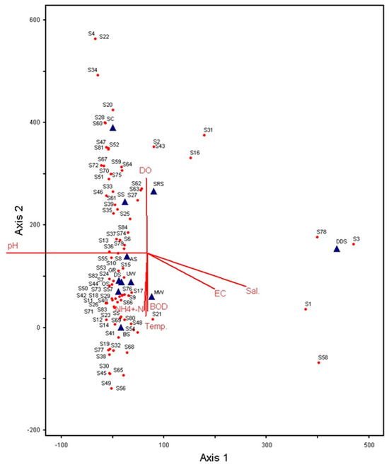 DCA graph of the relationships between the stations (blue triangles), macroinvertebrate species (red dots), and environmental variables. Parameter and station abbreviations: Temp.: Temperature; Sal.: Salinity; EC.: Electrical conductivity; DO: Dissolved oxygen; BOD: Biochemical oxygen demand; UW: Ulupınar Waterfall; BS: Bağırsak Stream; DDS: Düden Stream; SC: Sapadere Canyon; SS: Sapadere Stream; DS: Dim Stream; OS: Oba Stream; MW: Manavgat Waterfall; SRS: Sarıkavak Stream; AS: Anamur Stream; GR: Göksu River. Species codes: S1: Theodoxus anatolicus, S2: Potamopyrgus antipodarum, S3: Hydrobia sp., S4: Esperiana sangarica, S5: Radix labiata, S6: Gyraulus albus, S7: Physella acuta, S8: Nais barbata, S9: Nais bretscheri, S10: Nais pardalis, S11: Paranais frici, S12: Pristinella jenkinae, S13: Stylaria lacustris, S14: Potamothrix hammoniensis, S15: Psammoryctides albicola, S16: Caenis luctuosa, S17: Caenis macrura, S18: Baetis rhodani, S19: Baetis lutheri, S20: Centroptilum luteolum, S21: Potamanthus luteus, S22: Epeorus znojkoi, S23: Ischnura elegans, S24: Epallage fatime, S25: Calopteryx sp., S26: Gerris thoracicus, S27: Micronecta pusilla, S28: Clinotanypus pinguis, S29: Tanypus vilipennis, S30: Tanypus punctipennis, S31: Macropelopia nebulosa, S32: Ablabesmyia monilis, S33: Ablabesmyia longistyla, S34: Krenopelopia binotata, S35: Potthastia gaedii, S36: Brillia bifida, S37: Synorthocladius semivirens, S38: Epoicocladius flavens, S39: Rheocricotopus fuscipes, S40: Paracladius conversus, S41: Cricotopus (Cricotopus) annulator, S42: Cricotopus (Cricotopus) flavocinctus, S43: Cricotopus (Isocladius) sylvestris, S44: Cricotopus (Isocladius) reversus, S45: Cricotopus (Isocladius) suspicious, S46: Halocladius fucicola, S47: Eukiefferiella brevicalcar, S48: Tvetenia discoloripes, S49: Eukiefferiella clypeata, S50: Eukiefferiella claripennis, S51: Corynoneura validicornis, S52: Orthocladius (O.) thienemanni, S53: Einfeldia carbonaria, S54: Chironomus anthracinus, S55: Chironomus viridicollis, S56: Polypedilum pedestre, S57: Polypedilum convictum, S58: Polypedilum laetum, S59: Polypedilum scalaenum, S60: Polypedilum cultellatum, S61: Dicrotendipes nervosus, S62: Paratendipes albimanus, S63: Microtendipes pedellus, S64: Paratanytarsus lauterborni, S65: Micropsectra notescens, S66: Micropsectra praecox, S67: Cladotanytarsus mancus, S68: Tanytarsus gregarius, S69: Simulium spp., S70: Culicoides spp., S71: Perla bipunctata, S72: Leuctra sp., S73: Isoperla spp., S74: Hydropsyche incognita, S75: Hydropsyche bulbifera, S76: Hydropsyche modesta, S77: Hydropsyche pellucidula, S78: Hydropsyche contubernalis, S79: Hydroptila sp., S80: Philopotamus sp., S81: Synagapetus iridipennis, S82: Gammarus spp., S83: Gammarus pulex, S84: Palaemonetes sp.