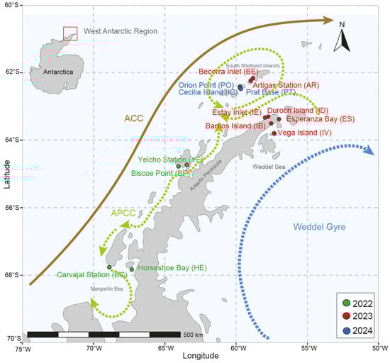 A total of 244 Tonicina zschaui specimens were collected during the austral summers of 2022, 2023, and 2024 at several locations across the South Shetland Islands and the Antarctic Peninsula, which are part of the West Antarctic Region (see Table 1 and Figure 1). The chitons were collected from the intertidal and subtidal zones at depths ranging from 5 to 17 m using scuba diving equipment (Tokyo, Japan). All specimens were fixed in 96% ethanol for genetic analysis.