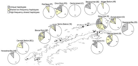 Pie chart map showing haplotype frequencies at sampling sites across the South Shetland Islands and the Antarctic Peninsula in the West Antarctic region. Each circular graph represents a locality, with segments indicating the relative frequencies of haplotypes. The widespread haplotype H1 is shown in white, site-specific haplotypes in gray, and low-frequency haplotypes in yellow. This figure highlights both shared and localized genetic patterns across the study area.