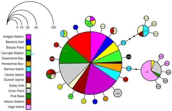 Genealogical relationships among haplotypes from different regions along the South Shetland Islands and Antarctic Peninsula were reconstructed using a median-joining network algorithm, which infers the most parsimonious connections between haplotypes while allowing for reticulations when equally parsimonious alternatives exist. This approach is particularly suited for intraspecific data without recombination, as it identifies potential ancestral haplotypes and visualizes mutational steps among them, facilitating the interpretation of genealogical relationships and geographic structuring. The network was built using COI sequence data in Hapview Beta [35]. Additionally, pie charts of haplotype frequencies by locality were plotted on a map to visualize the variation in haplotype diversity and frequency across the South Shetland Islands and the Antarctic Peninsula.