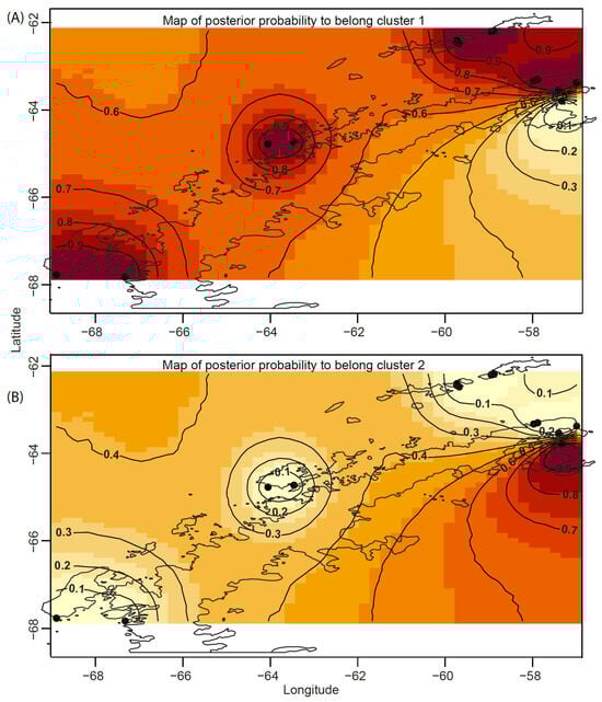 (A,B) Posterior probability maps showing the spatial assignment of T. zschaui individuals to genetic populations inferred from Geneland, based on COI mitochondrial DNA sequences, across the Antarctic Peninsula, South Shetland Islands, and Weddell Sea. Isolines represent the posterior probability contours delineating the spatial position of the genetic discontinuity between clusters or populations. Darker shades indicate higher posterior probabilities of individual membership within each inferred population.