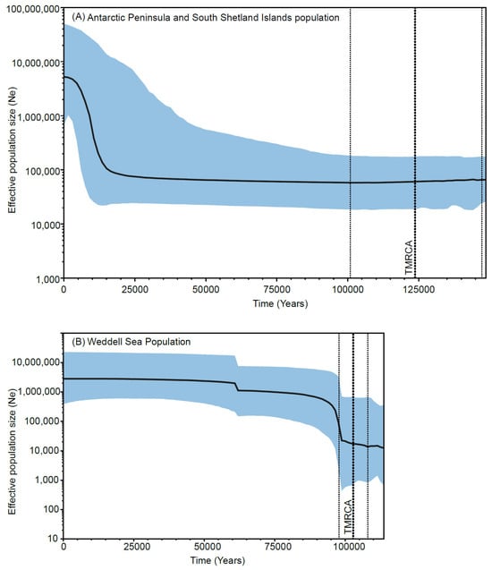 Bayesian Skyline plots analyses, run using estimated mean rates (Antarctic Peninsula and South Shetland Islands: mean = 1.823 × 10−8, SD = 1.823 × 10−9; Weddel Sea: mean = 4.929 × 10−11, SD = 4.929 × 10−12), revealed a marked demographic expansion in the Antarctic Peninsula and South Shetland Islands population beginning around 15,000 years ago (Figure 5A). This expansion involved an increase in effective population size by more than one order of magnitude. The estimated time of the most recent common ancestor (TMRCA) for this population was approximately 125,000 years ago (HPD 95%: 100,930–148,680 years). Meanwhile, the Weddell Sea population did not show evidence of significant demographic expansion over the last 100,000 years (Figure 5B), and the estimated TMRCA was approximately 100,000 years (HPD 95%: 98,000–136,000 years).