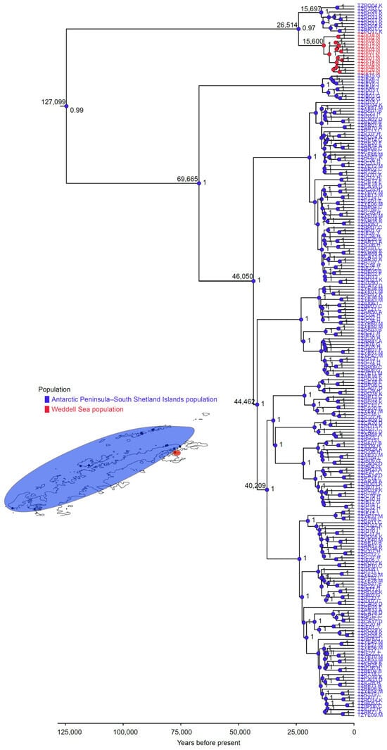 Discrete phylogeographic analysis identified a maximum clade credibility tree supporting a common ancestor for both populations dating to ~127,000 years ago (posterior probability = 0.99; Figure 6). This represents the oldest lineage of Tonicina zschaui, originating in the Antarctic Peninsula–South Shetland Islands population, from which dispersal across West Antarctica began. A subsequent divergence between the Antarctic Peninsula–South Shetland Islands and Weddell Sea populations occurred ~26,514 years ago (posterior probability = 0.97), giving rise to the ancestor of the Weddell Sea population. Around 15,600 years ago, with a posterior probability of 1.0, this ancestor established a distinct lineage in the Weddell Sea, characterized by reciprocal monophyly. Individuals in this lineage were more closely related to each other than to those in the Antarctic Peninsula–South Shetland Islands lineage (Figure 6).