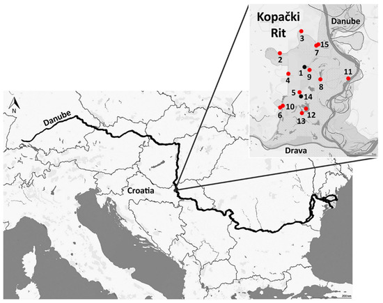 Research area, Kopački Rit Nature Park (locations within the park where Limnomysis benedeni was found are marked in red, and locations where L. benedeni is absent are marked in black). Sampling sites: 1—Tikveš dam; 2—Šuma Siget; 3—Čarna channel; 4—Podunavlje channel; 5—Podunavlje dam; 6—Kopačevo dam; 7—Zlatna Greda dam; 8—Semenča channel; 9—Vemeljski Dunavac channel; 10—Lake Sakadaš; 11—Danube, channel Petreš; 12—Kopačko lake; 13—Hulovo channel; 14—Četverokut channel; and 15—Zlatna Greda channel.