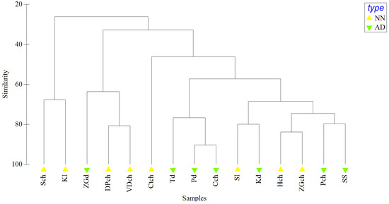 Hierarchical cluster analysis of the group average of crustacean species abundance in two types of sites. Abbreviations: AD—anthropogenically disturbed sites, NN—near-natural sites; site ID given in Table 1.
