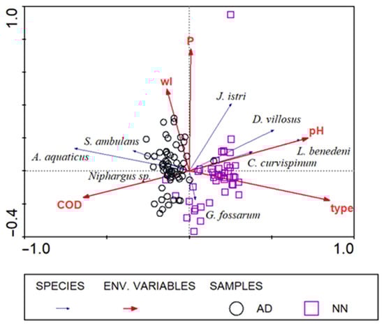 RDA plot indicating statistically significant environmental variables for Crustacea species. Abbreviations: wl—water level of Danube (cm), P—phosphorus content (mg P/L), type—habitat type (anthropogenically disturbed (AD) and near-natural (NN)), and COD—chemical oxygen demand content (mg O2/L).