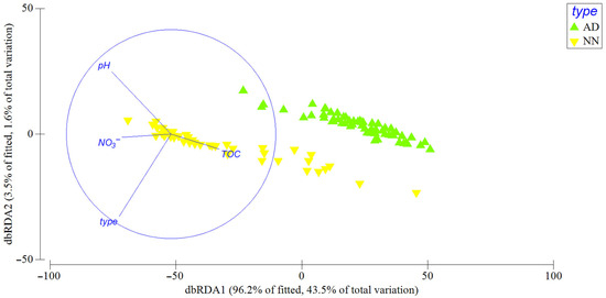 dbRDA of the most strongly correlated environmental variables with the abundance of Crustacea in the entire study. Abbreviations: TOC—total organic carbon, NO3−—nitrate ion concentration, type—habitat categories, AD—anthropogenically disturbed sites, and NN—near-natural sites.
