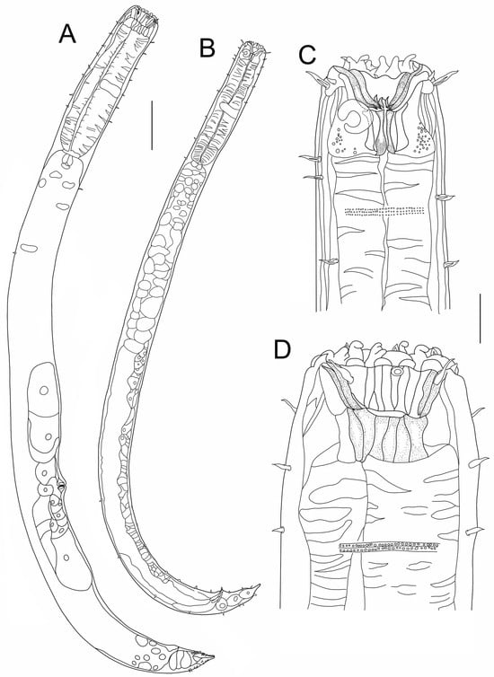 Gammanema papillatum sp. nov. (A) allotype female entire body; (B) holotype male entire body; (C) holotype male cephalic region; (D) allotype female cephalic region (scale bar: (A,B) = 100 μm; (C,D) = 20 μm).