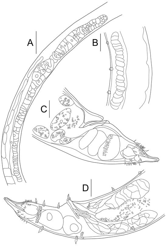Gammanema papillatum sp. nov. (A) paratype male testis; (B) paratype male precloacal supplement region; (C) allotype female tail region; (D) holotype male tail region (scale bar: (A) = 50 μm; (B–D) = 20 μm).