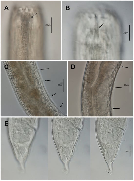 Gammanema papillatum sp. nov. light micrographs (A) ♂ loop-shaped amphid (arrow); (B) ♀ unispiral amphid (arrow); (C,D) ♂ different paratypes with papilla-shaped precloacal supplementary organs (arrows); (E) ♀ tail region at different z-plain, showing cuticular spines (scale bar: (A–E) = 20 μm).