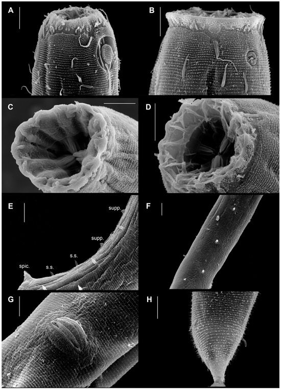 SEM micrographs of Gammanema papillatum sp. nov. (A) ♂, dorsolateral view of cephalic region with loop-shaped amphid; (B) ♀, dorsolateral view of cephalic region with unispiral amphid; (C,D) ♀, apical view of the mouth opening of different specimens showing three rhabdions terminating in three branches (denticles); (E) ♂, lateral view of cloacal region, with protruding spicules (spic) followed by two somatic setae (s.s.) positioned between the posterior-most precloacal supplementary papilla (supp); (F) ♂, ventral view above precloacal region showing vertically arranged supplementary papillae; (G) ♀, ventral view of vulva lip; (H) ♀, tail region with numerous minute cuticular spines (arrows) (scale bar: (A–H) = 10 μm).