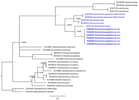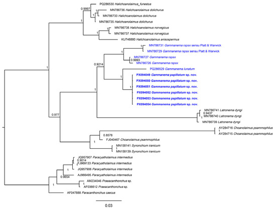 In the 18S BI tree (Figure 5), the six sequences of Gammanema papillatum sp. nov. formed a strongly supported clade (PP = 1.00) with G. lunatum (PQ268529), indicating a close phylogenetic relationship. This grouping was nested within a larger, well-supported assemblage (PP = 0.9993) that also included other Gammanema spp. from GenBank (MN786727, MN786726, MN786731, MN786729), suggesting monophyly of the genus. No sequences of G. agglutinans or G. conicauda were available for comparison, preventing direct molecular assessment of their relationships to the new species. In the 28S BI tree (Figure 5), the topology seen from Leduc & Zhao (2025) [3] was retained. The new species again grouped closest to G. lunatum, with strong support (PP = 0.96). The genus once more formed a monophyletic group, albeit with moderate support (PP = 0.87), and clustered with a group of Latronema with strong support (PP = 1.00).