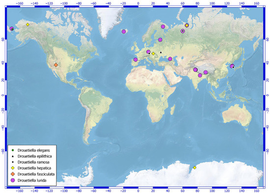 The distribution map (Figure 1) highlights the locations where various Drouetiella strains have been identified, offering insight into the global dispersal and diversity of this genus. The species Drouetiella lurida has been known since 1849 [31]; numerous records of its occurrence have been documented in the literature. Based on these data, the species is characterized by a multizonal distribution. However, it is important to note that the number of findings confirmed by molecular data is relatively small, and most of the records should be considered provisional. Nevertheless, even the confirmed records indicate that the species exhibits broad ecological plasticity, thriving in both aerophytic and subaerophytic conditions as well as underwater as an epilithic organism.