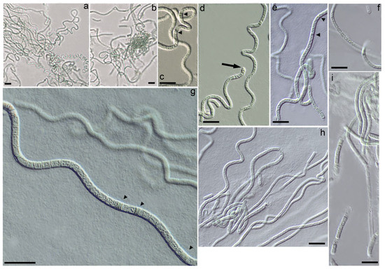Light micrographs of the Drouetiella elegans LID–150280. Scale bar = 10 μm: (a,b) Variation in the degree of trichomes coiling from bent, flexuous to spiral coils; (c,e) Necridic cells in trichomes; (d) The terminal cells are untapered and rounded; (f) Elongated cells in mature trichomes; (g) Necridic cells in flexuous trichomes; (h) Irregular length of cells in mature trichomes; (i) Sheath tightly embraces trichome.