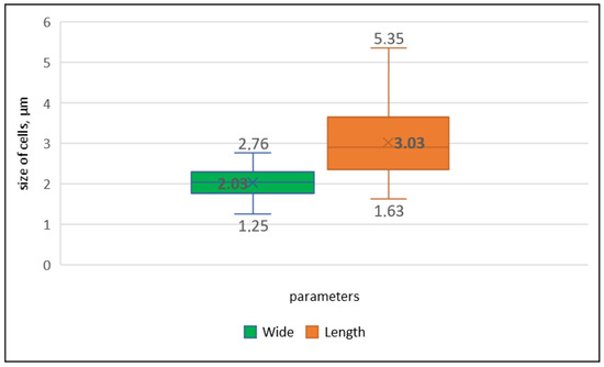 Distribution of the average (in bold), maximum (above boxes), and minimum (under boxes) values of length and width of cells in the Drouetiella elegans strain LID–150280.