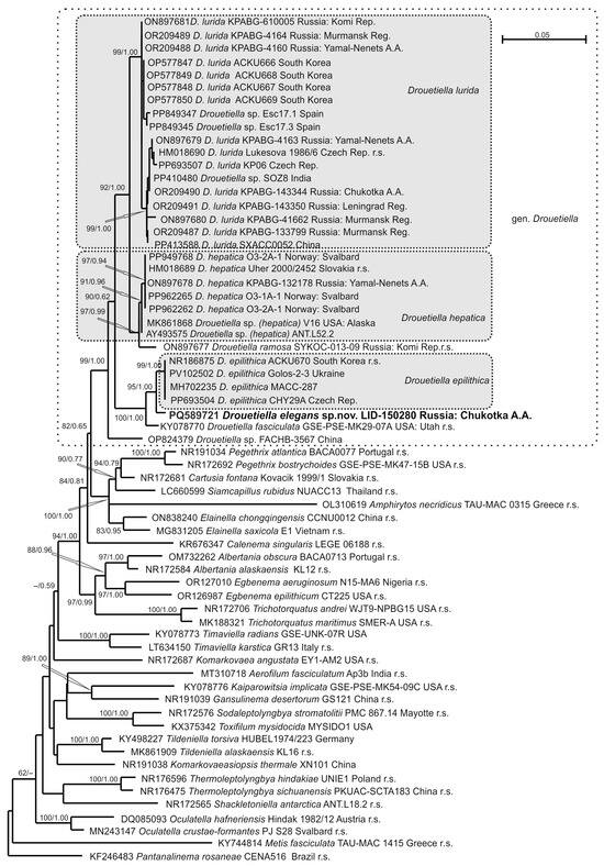 The similarity of the 16S rRNA gene of strain Drouetiella elegans LID–150280 to reference strains of Drouetiella species varied from 96.31% to 98.97%, while the dissimilarity of the 16S–23S ITS rRNA region ranged from 12.27% to 20.43% (Table 1). The highest similarity was observed between strain Drouetiella elegans LID–150280 and D. epilithica ACKU670 (98.97%/12.27%), followed by D. fasciculata GSE-PSE-MK29-07A (98.28%/15.80%). The infraspecific nucleotide sequence similarity for 16S of Drouetiella lurida is 99.43%, D. hepatica—99.84%, D. epilithica—100%. The nucleotide sequence dissimilarity the 16S–23S ITS rRNA region of Drouetiella lurida is 4.04%, D. hepatica—3.43%, D. epilithica—0.29%.