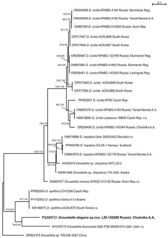 The 16S rDNA sequence similarity of Drouetiella elegans varies from 96.31% with D. lurida Lukesova 1986/6 to 98.97% with D. epilithica ACKU670, which fits well into the 98.7–99.00% threshold for Cyanobacteriota species delimitation [28,29]. The highest value of 16S–23S ITS rRNA sequence dissimilarity of Drouetiella elegans was registered with D. epilithica ACKU670 (12.27%), and the lowest was 20.43% with D. hepatica Uher 2000/2452. The threshold of sequence dissimilarity in the 16S–23S ITS rRNA region of more than 7% suggested strains as belonging to distinct species [30], which additionally supports species status for Drouetiella elegans. The species Drouetiella lurida, D. hepatica and D. epilithica demonstrates the high level of infraspecific 16S gene similarity (99.43–100%) and low level of 16–23S ITS dissimilarity (0.2–4%) among specimens from remote localities, which characterizes all species as genetically stable units and further confirms the molecular genetic differentiation of D. elegans at the species level.