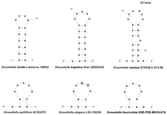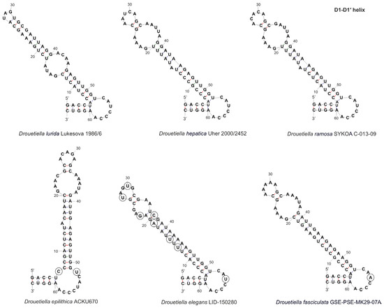 The V2 region was reduced in strain Drouetiella elegans LID–150280, similar to D. epilithica and D. fasciculata (Figure 8). It had a stem only two steps long and a terminal loop with five nucleotides, with only two nucleotides clearly distinguishing strain Drouetiella elegans LID–150280 from D. epilithica and D. fasciculata. The V2 region in Drouetiella lurida, D. hepatica, and D. ramosa had a stem length of 6–7 steps and a variable loop region, both in length and nucleotide sequence.