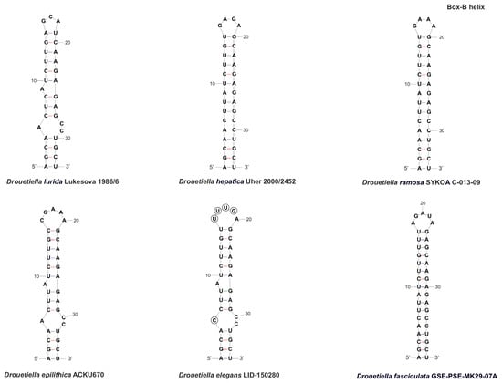 The Box–B helix of strain Drouetiella elegans LID–150280 resembled those of D. lurida and D. epilithica, with two loops and a bulb composed of a single unpaired nucleotide (A) in the middle part of the stem (Figure 7). The basal loop of strain Drouetiella elegans LID–150280 differed in the C–A substitution compared to D. lurida and D. epilithica, and the terminal loop had a unique sequence among other species due to four substitutions (UUUG).
