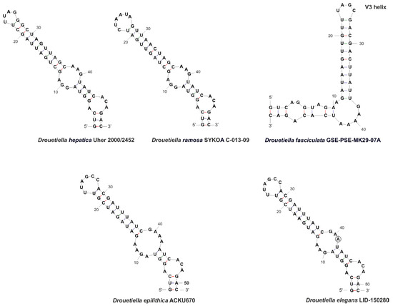 The V3 region of strain Drouetiella elegans LID–150280 was similar to that of D. epilithica, D. hepatica, and D. ramosa in the nucleotide sequence of the basal stem and loop but differed in the sequence of the middle loop (Figure 9).