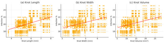 Scatter plots showing the correlation between infection area (%) and (a) knot length, (b) knot width, and (c) knot volume across host-isolate combinations. Red lines represent the fitted linear regression trends indicating positive associations between knot parameters and infection area.