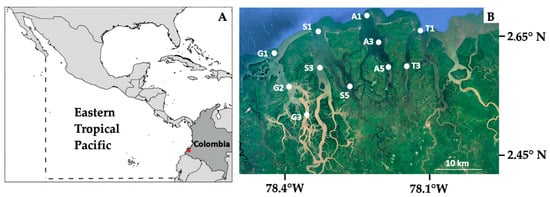 This study was conducted within the Sanquianga–Tapaje estuarine system, which forms part of the Parque Nacional Natural Sanquianga, a protected area located on the southern Colombian Pacific coast (2°22′–2°04′ N, 78°76′–75°37′ W), within the easternmost sector of the Eastern Tropical Pacific (Figure 1) [36].