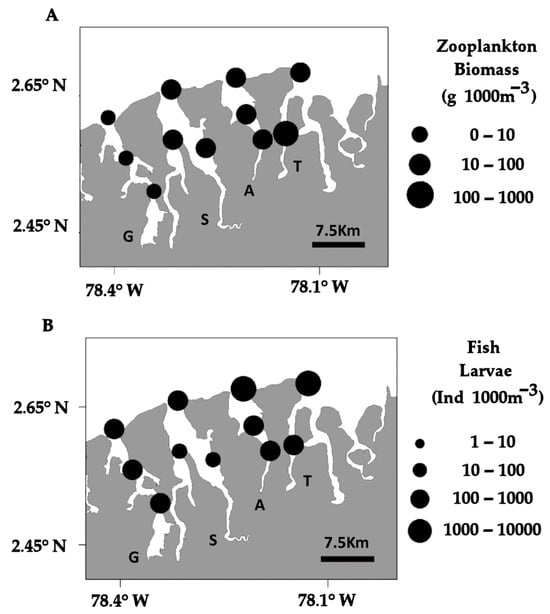 Zooplankton dry biomass exhibited substantial spatial variation across sampling stations, ranging from 0.34 to 180.43 g 1000 m−3, with the highest values observed inside of the Tapaje River. Fish larvae abundance showed a heterogeneous spatial distribution, with elevated concentrations generally associated with outer estuarine zones (Figure 2).