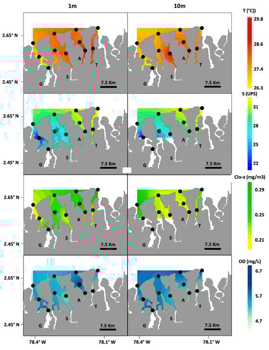 Spatial variation in temperature (T), salinity (S), chlorophyll-a (Clo-a), and dissolved oxygen (DO) in the Sanquianga Tapaje estuarine system at depths of 1 m and 10 m in August 2019. Sampling locations: Guascama (G), Sanquianga (S), Amárales (A), and Tapaje (T).