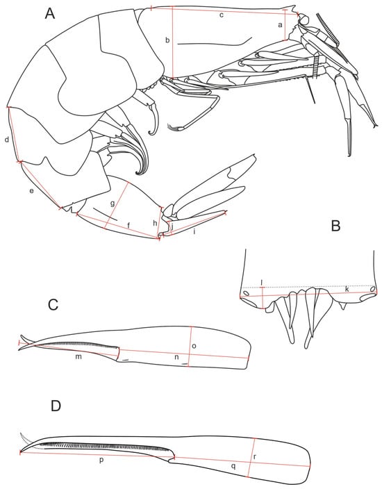 Figure 2. Scheme of measurements. (A) Measurements of carapace, pleon, and telson: a—postsinusial height of carapace; b—maximum height of carapace; c—carapace length (detailed information is provided in the section on measurement methodology); d—length of 4th pleonic somite; e—length of 5th pleonic somite; f—length of 6th pleonic somite; g—maximum height of 6th pleonic somite; h—distal height of sixth somite; i—length of telson; j—proximal width of telson. (B) Measurements of telson end: k—width of telson end; l—depth of telson concavity/convex curvature. (C) Measurements of 1st pereopod chela: m—length of fingers; n—length of palm; o—height of palm. (D) Measurements of 2nd pereopod chela: p—length of fingers; q—length of palm; r—height of palm.