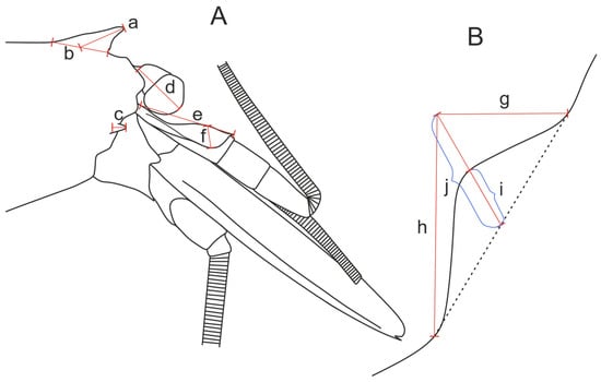 Figure 3. Scheme of measurements. (A) Measurements of carapace: a—length of rostrum; b—rostrum base length; c—length of branchiostegal tooth; d—length of eye cornea and stout part of eyestalk; e—length of stylocerite; f—height of stylocerite in highest part. (B) Measurements of sinus: g—length of branchiostegal sinus; h—height of branchiostegal sinus; i—median branchiostegal sinus depth; j—branchiostegal sinus median. - Pleon (Figure 2A): Length of somites IV–VI, maximum height of the sixth somite, distal height of the sixth somite;