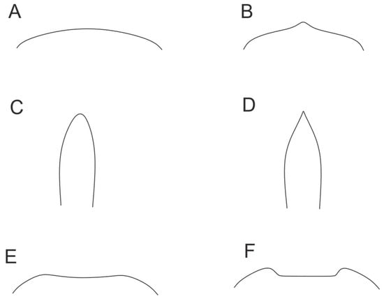 Figure 4. Scheme of pleonic relief variations in the dorsal surface in a transverse plane. (A) Dorsal surface of rounded somite; (B) dorsal surface of carinate somite; (C) dorsally rounded laterally compressed somite; (D) dorsally carinate laterally compressed somite; (E) dorsal surface of flattened somite, called here with depression; (F) dorsal surface of grooved somite, called here with depression. - Another point at issue in the pleonic relief is the presence of a flattened (Figure 4E) or grooved (Figure 4F) zone on the pleonic somites. Almost any flattened zone is grooved to some extent in the middle and any grooved zone is flattened in the anterior or posterior part, so we synonymize these terms, assuming that flattenings and grooves may represent the same underlying structure, expressed to varying degrees, but the assessment of their prominence is subjective. As our material shows, differences in groove depth in the dorsal part of the somites are not significant in species differentiation. We suggest the term “depressions” for this kind of dorsal ornamentation as an intermediate between the two mentioned above.