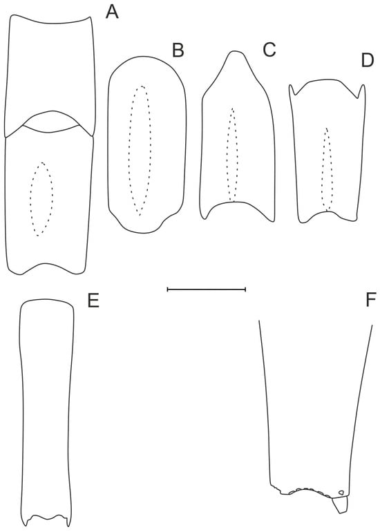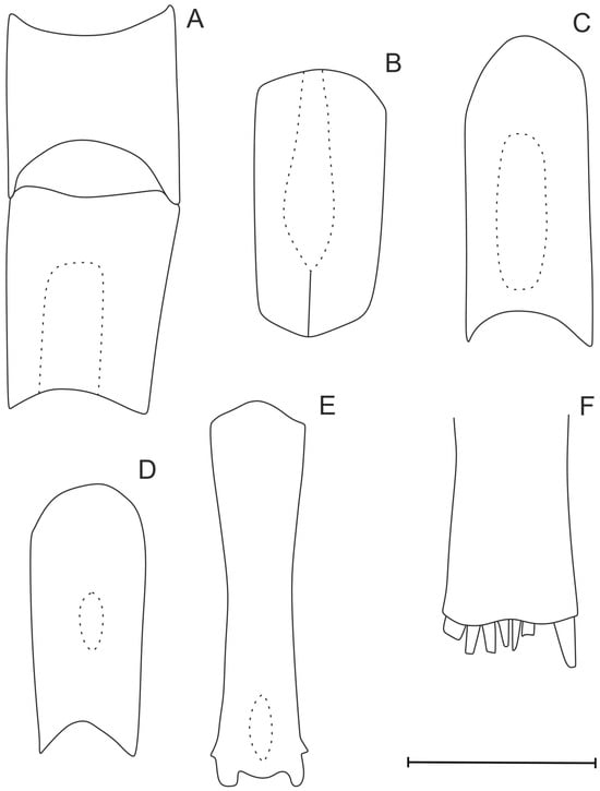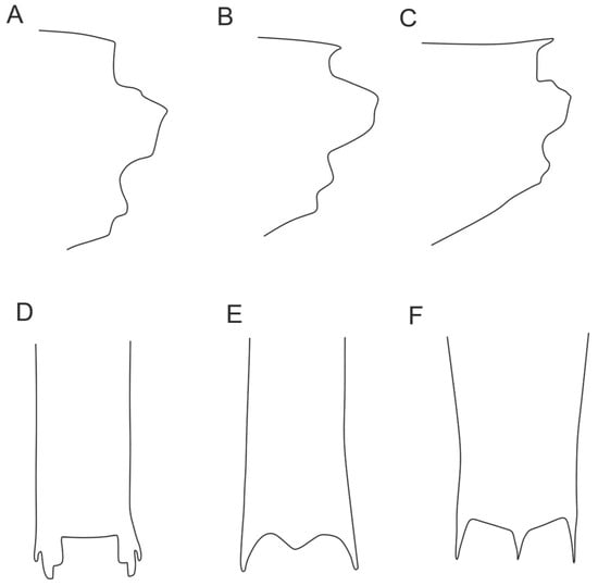Figure 5. Variations in posterodorsal end of sixth pleonic somite. (A) Absence of any protruded structure—lateral view; (B) posterodorsal protrusion—lateral view; (C) posterodorsal tooth—lateral view; (D) absence of any protruded structure—dorsal view; (E) posterodorsal protrusion—dorsal view; (F) posterodorsal tooth—dorsal view.