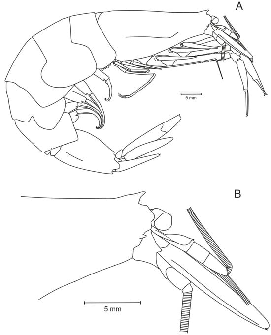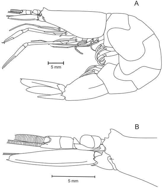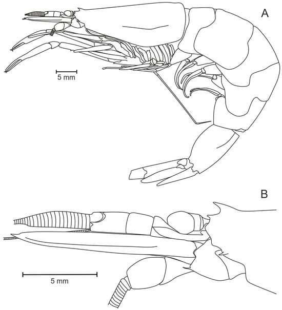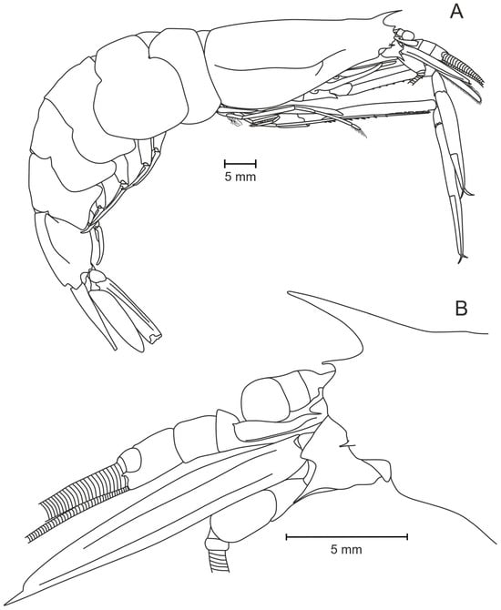 Pasiphaea allainae sp. nov., holotype, female (WAL09-M195-200) CL 25.6 mm. (A) Whole specimen; (B) anterior part of carapace.
