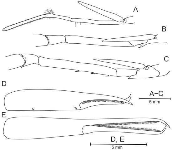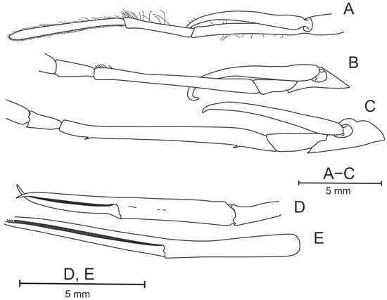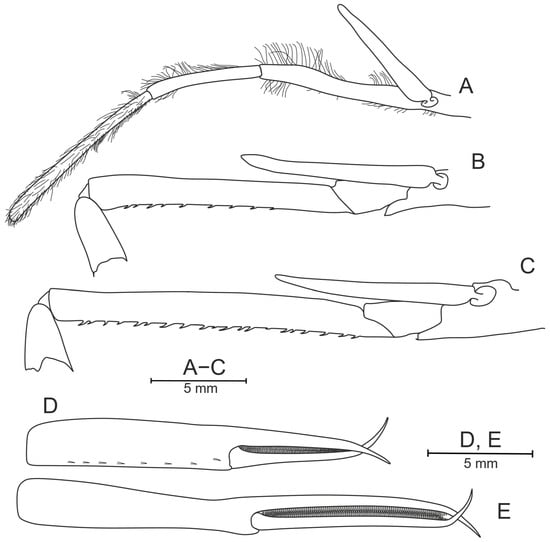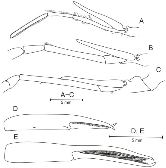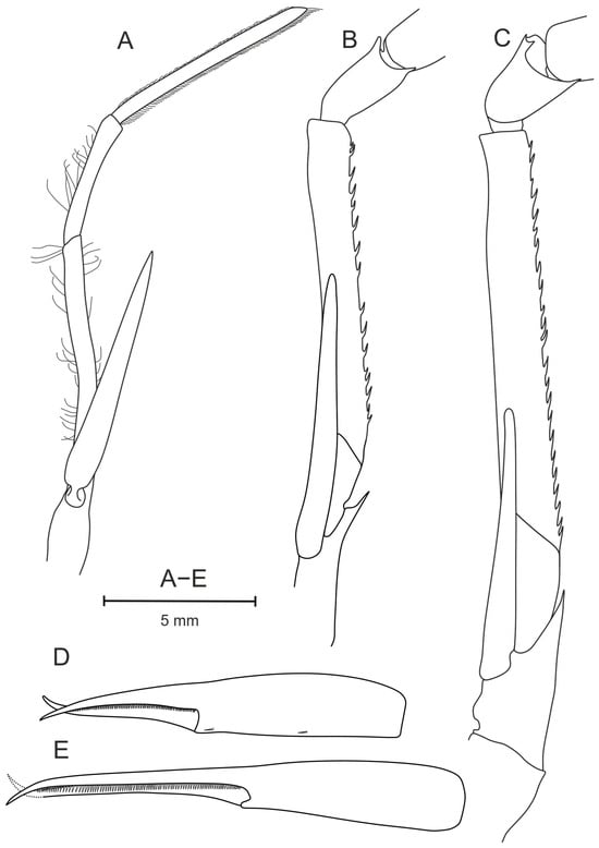 Pasiphaea allainae sp. nov., holotype, ovigerous female (WAL09−M195−200) CL 25.6 mm. (A) Right maxilliped III, lateral view; (B) proximal part of right pereopod I, lateral view; (C) proximal part of right pereopod II, lateral view; (D) chela of right pereopod I, mesial view; (E) chela of right pereopod II, mesial view.
